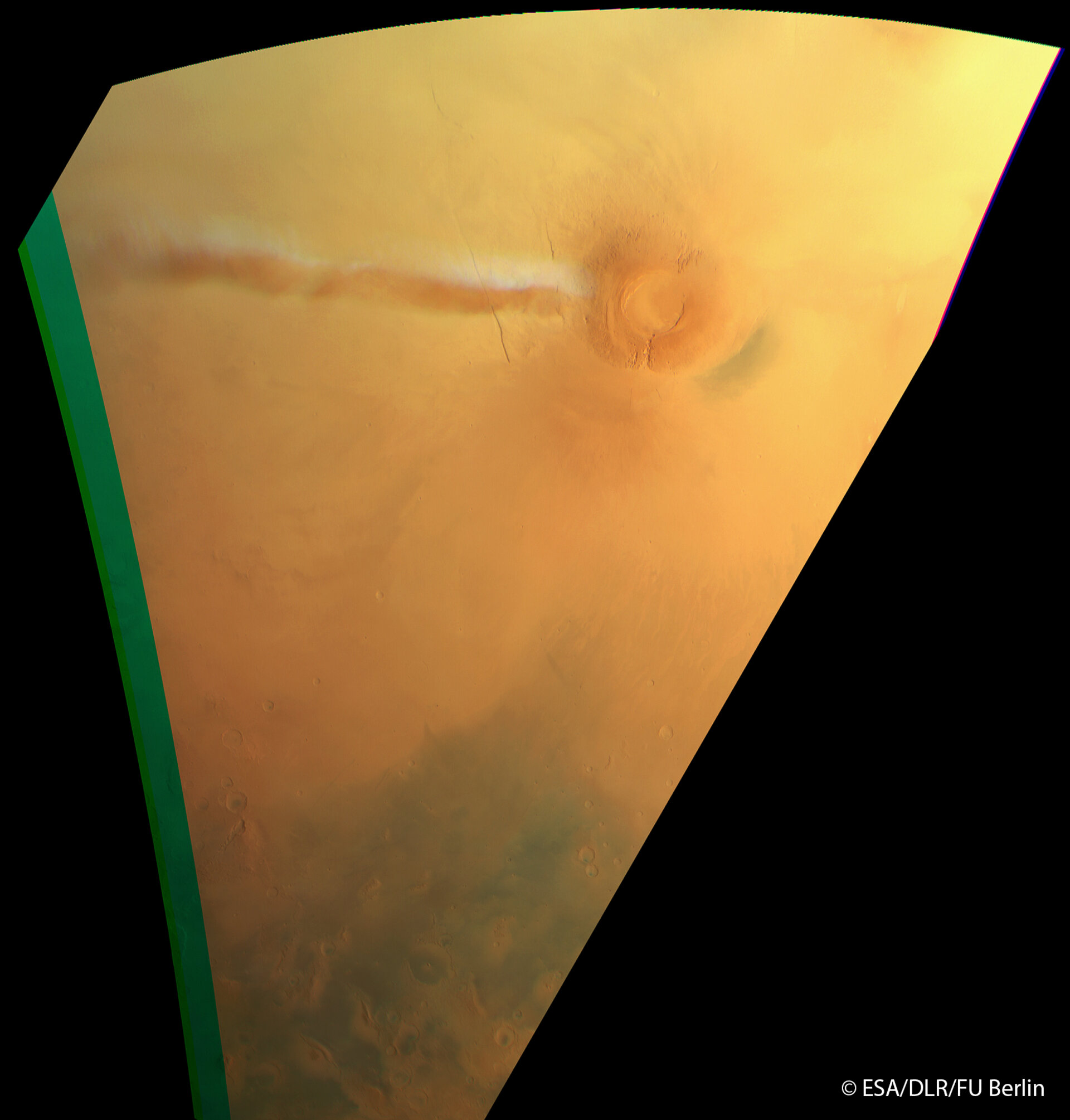 The elongated cloud hovering near Arsia Mons this year was also observed with the visible and near-infrared mapping spectrometer, OMEGA, and the High Resolution Stereo Camera (HRSC) on Mars Express, providing scientists with a variety of different data to study this phenomenon.