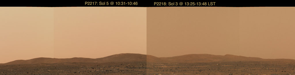 Difference in sky color in Spirit’s first panoramic images, where frames show different levels of darkness, depending on the weather when each frame was taken (light dust conditions on the left, heavy dust on the right).