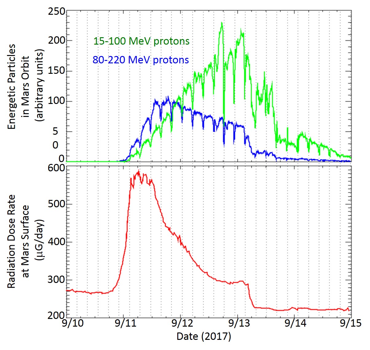 The horizontal axis for both parts of this graphic is the time from Sept. 10 to Sept. 15, 2017. The upper portion of this graphic shows the increase in protons in two ranges of energy levels (15- to-100 million electron volts and 80-to-220 million electron volts), as recorded by the Solar Energetic Particle instrument on NASA’s on NASA’s Mars Atmosphere and Volatile Evolution orbiter, or MAVEN. The lower portion shows the radiation dose on the Martian surface, in micrograys per day, as measured by the Radiation Assessment Monitor instrument on NASA’ Curiosity Mars rover. Micrograys are unit of measurement for absorbed radiation dose.