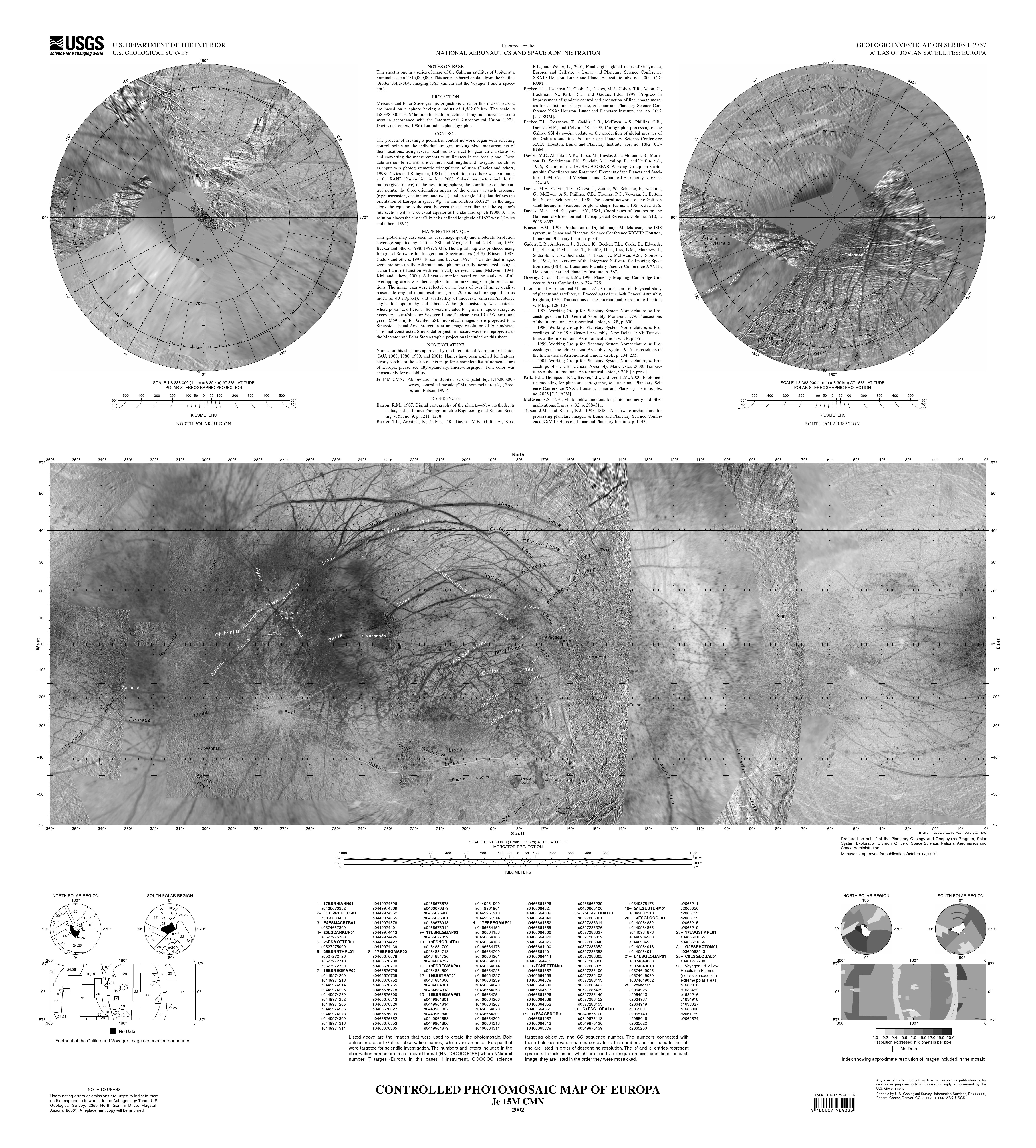 NOMENCLATURE Names on this sheet are approved by the International Astronomical Union (IAU, 1980, 1986, 1999, and 2001). Names have been applied for features clearly visible at the scale of this map; for a complete list of nomenclature of Europa, please see http://planetarynames.wr.usgs.gov. Font color was chosen only for readability.