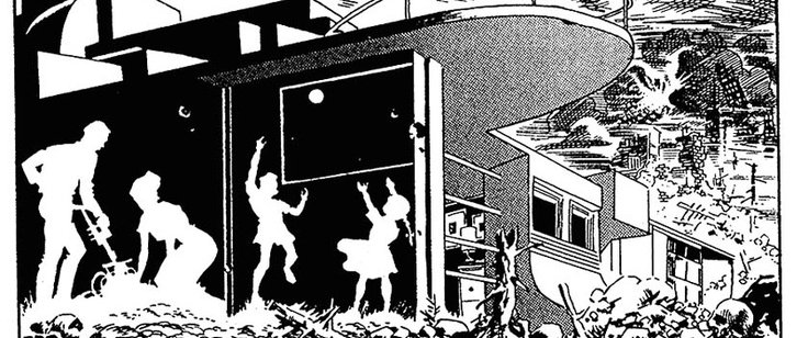 Ten o'clock. The sun came out from behind the rain. The house stood alone in a city of rubble and ashes. This was the one house left standing. At night the ruined city gave of a radioactive glow which could be seen for miles.